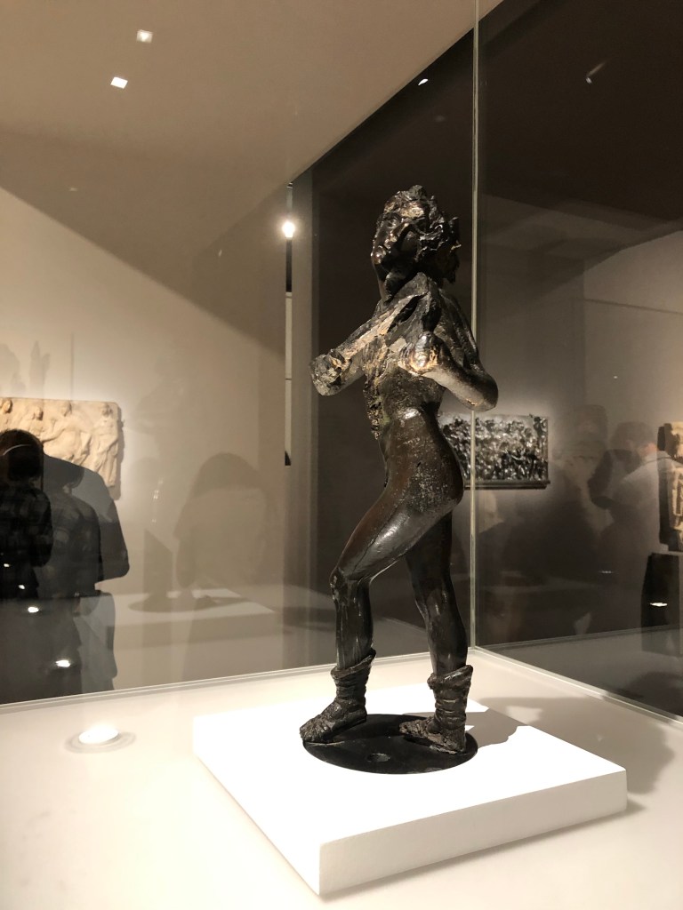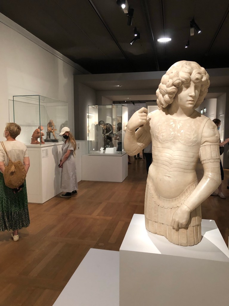 Orphée de Bertoldo de GiovanniLe combat entre Hercule et Antee d’Antonio PollaioloCertaines œuvres n’ont pas pu arriver à Paris à cause de l’épidémie et on en voit la reproduction.Gianfrancesco Rustici reprend dans ses groupes des motifs de la fresque désormais disparue de La Bataille d’Anghiari de Leonardo Da VinciSuiveur d’Andrea del VerrocchioUn Donatello original, La CrucifixionTête de franciscain, où comment montrer l’extaseMarie-Madeleine de Guido MazzoniDes sculptures vivantes au point qu’on y voit des comédiennes dans leur expressivité.Il PeruginoS’enlever les épines du piedUn guerrier de Tullio Lombardo.Mercure, de l’Antico, le premier voyageur.Le Cupidon retrouvé à New York en 1995 dans le siège de l’Ambassade Française au premier plan et l’esclave de Michel-Ange à l’arrière. La pièce maîtresse, le summum de la beauté et de la délicatesse et de l’amour qui est exprimé entre les deux personnages Bacchus et Ariane de Tullio LombardoLe Bramante, un chevalier.